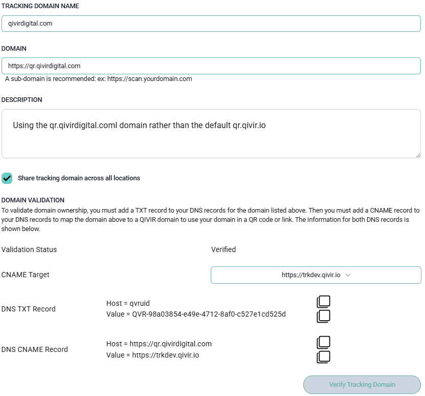 Depending on your subscription level, you can add your own domain name to be used when creating a QR code. This is something you should do before creating QR codes as the tracking domains can't be changed after you begin circulating your QR codes for use in your marketing efforts - but you can use your new tracking domains on future QR codes after they have been verified.