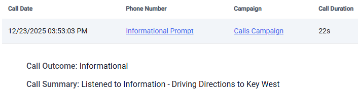 For example, if the caller listened to your specials, then searched for a store near them, attempted a transfer to that store but the call was not answered and they fell back to the main menu and left a voicemail instead - the call outcome summary will list all of these actions, including any details about each one. In this example, the call outcome itself will be listed as their last action of Voicemail.