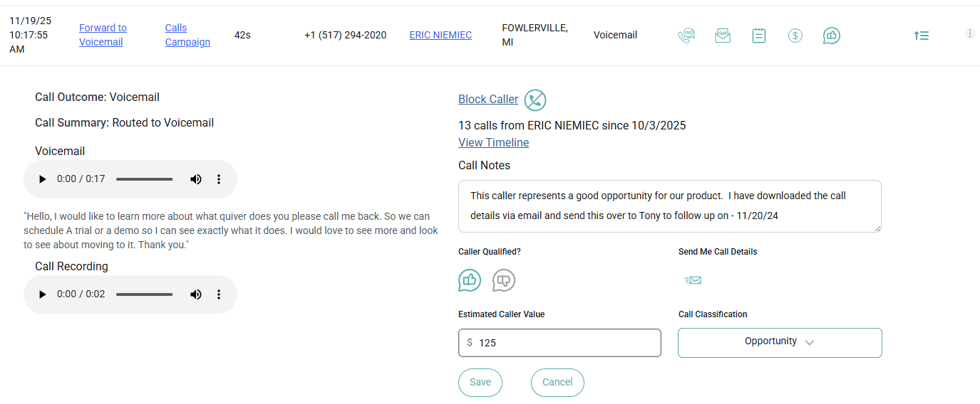As calls are made to your phone number and come into your dashboard, you can classify the call after reviewing all the available details about the call - this helps you keep track of the calls where action is required on your side to maintain customer satisfaction or close on a potential lead.